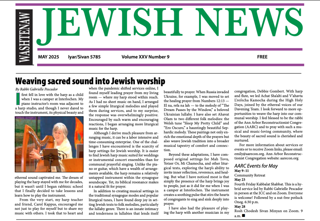 Weaving Sacred Sound into Jewish Worship, in the May 2025 Washtenaw Jewish News