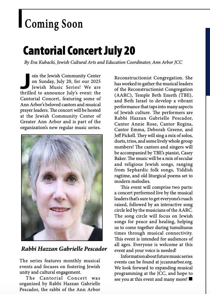 Save the date for a Cantorial Concert on Sunday, July 20, 2025 at 2pm.