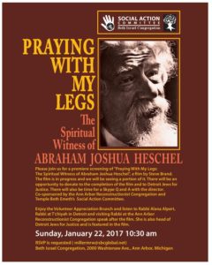 AARC is co-sponsoring the Sun, January 22, 2017, 10:30am – 12:30pm screening of the documentary-in-progress, Praying with My Legs, about Rabbi Abraham Joshua Heschel. Its filmmaker, Steve Brand, will speak via Skype and Rabbi Alana Alpert, who is in the film, will add her own remarks. The brunch and film showing is organized by the Beth Israel Congregation Social Action Committee and will honor their volunteers and include opportunities to support the completion of the film, and Detroit Jews for Justice.