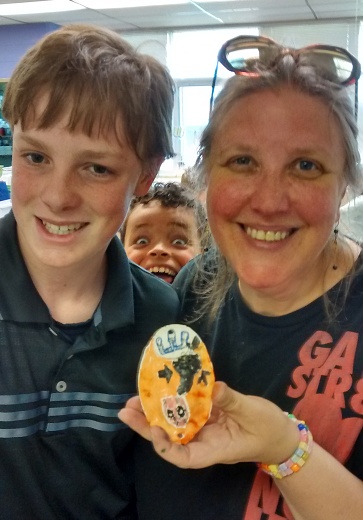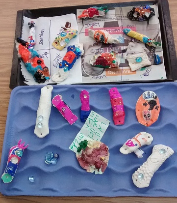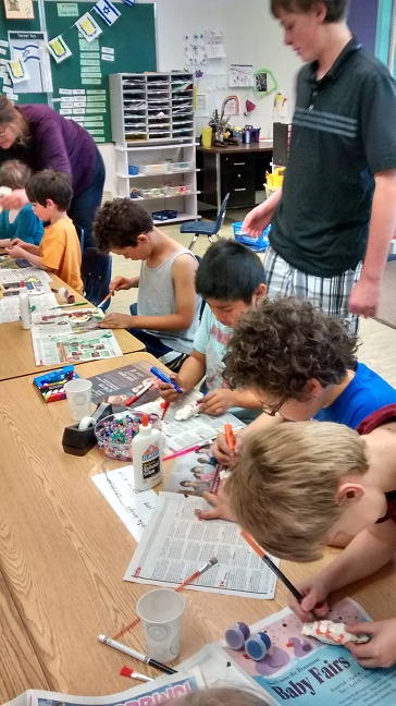 The students rolled out their airdry clay and formed them into beautiful original cases, working with shapes and wood pieces for texture. Then Marcy and the teachers made the letter Shin for each child and set their mezuzot cases to dry, reminding them that over the week they might think about what prayer they would like to say while entering and exiting their bedrooms. The next week, the kids painted and embellished their beautiful cases. They then copied the Hebrew of the Shema and first words of the V’ahavta onto origami paper “scrolls” along with their own original prayers and set them inside the mezuzah cases to make their personalized mezuzot. By adding their own prayers to the scroll in the mezuzah, the students learned about Jewish “lifehacks,” explained by Rabbi James Brandt, director of the Jewish Federation of the East Bay in a January 2015 Jewish Week article “as this generation’s equivalent of ‘do-it-yourself Judaism,’ represented by the groundbreaking 1973 publication of the The First Jewish Catalog (co-edited by Michael Strassfeld), which offered a model of creating Jewish life ‘outside the official system.’”